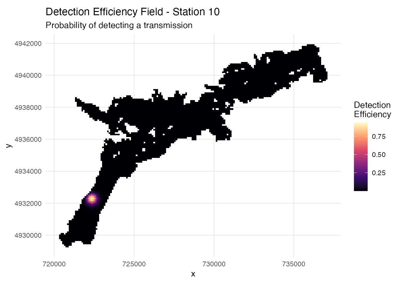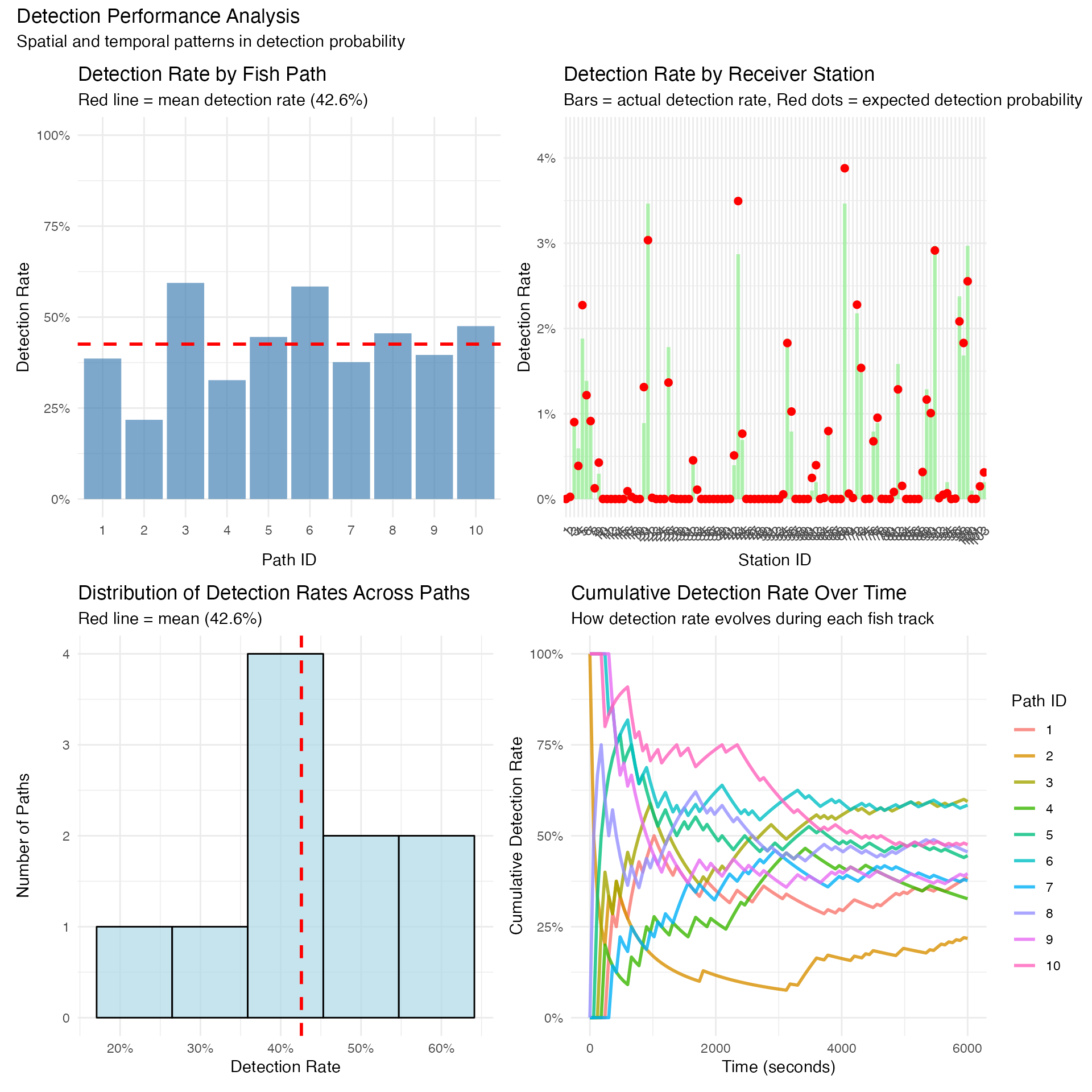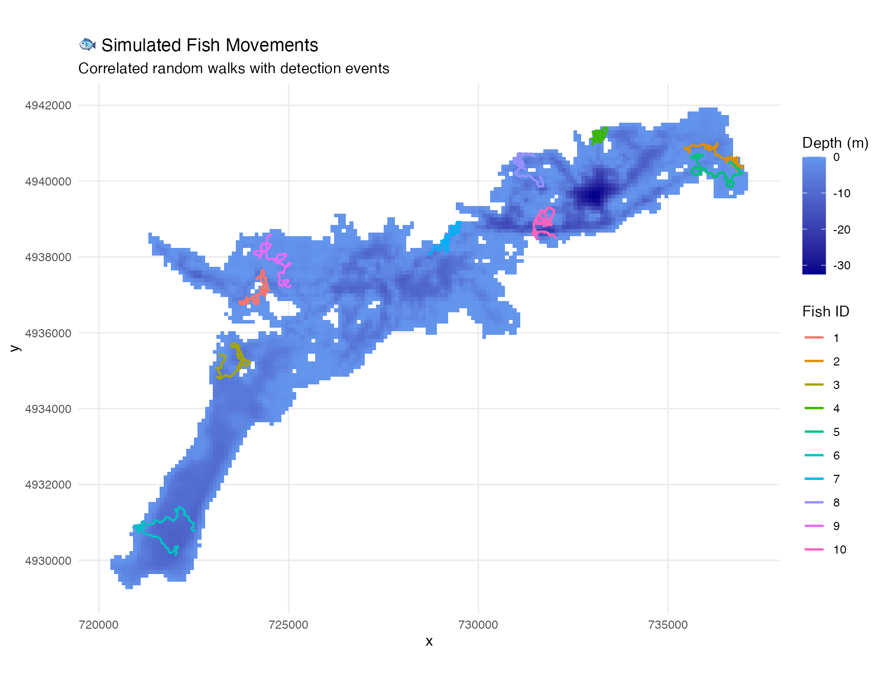 Key Applications: - π‘ Optimize receiver array configurations for maximum coverage - π Generate detection efficiency models based on distance and depth - π Simulate realistic fish movements and generate detection patterns - π‘ Estimate space use and home range from simulated data - πΏ Analyze habitat selection patterns
