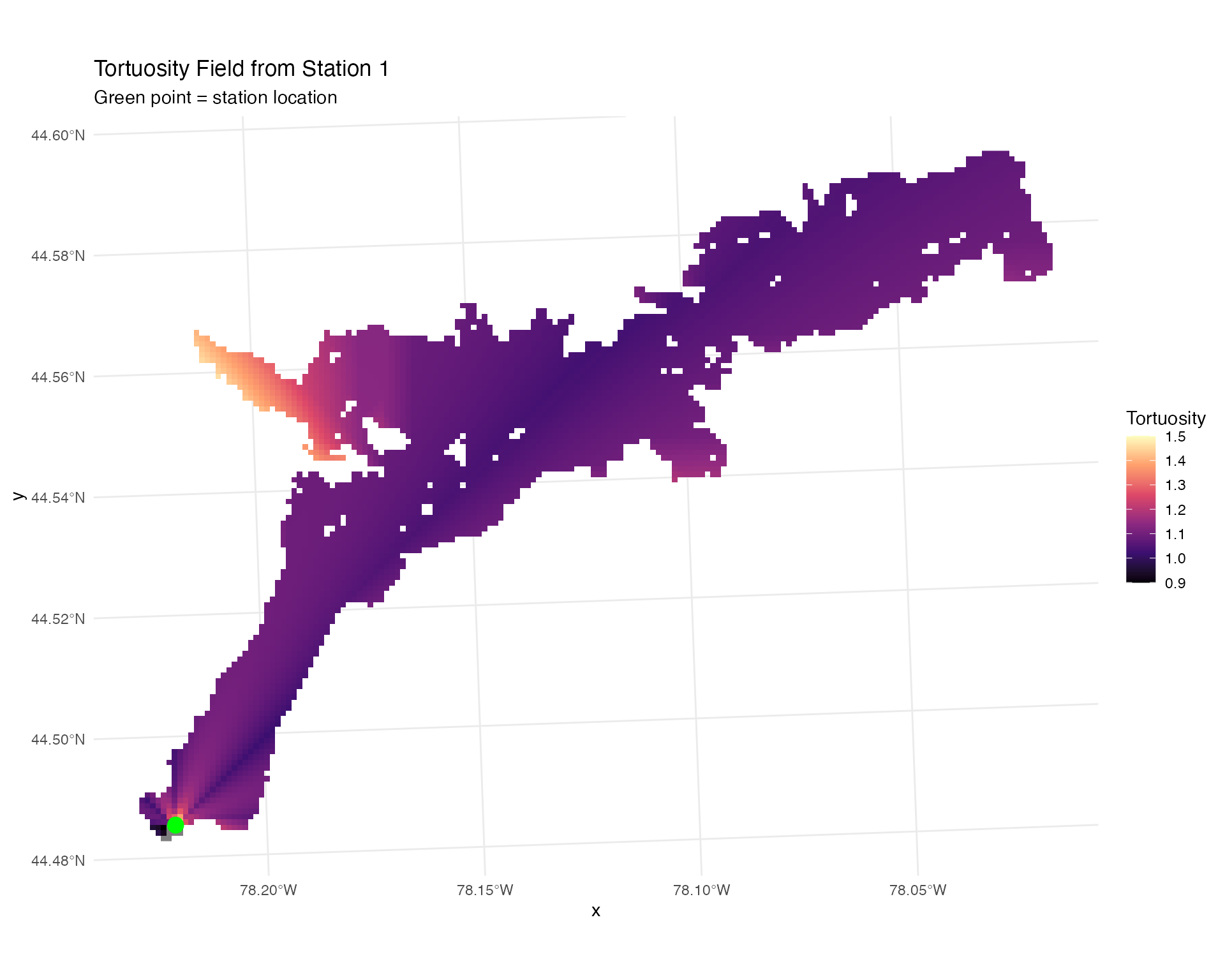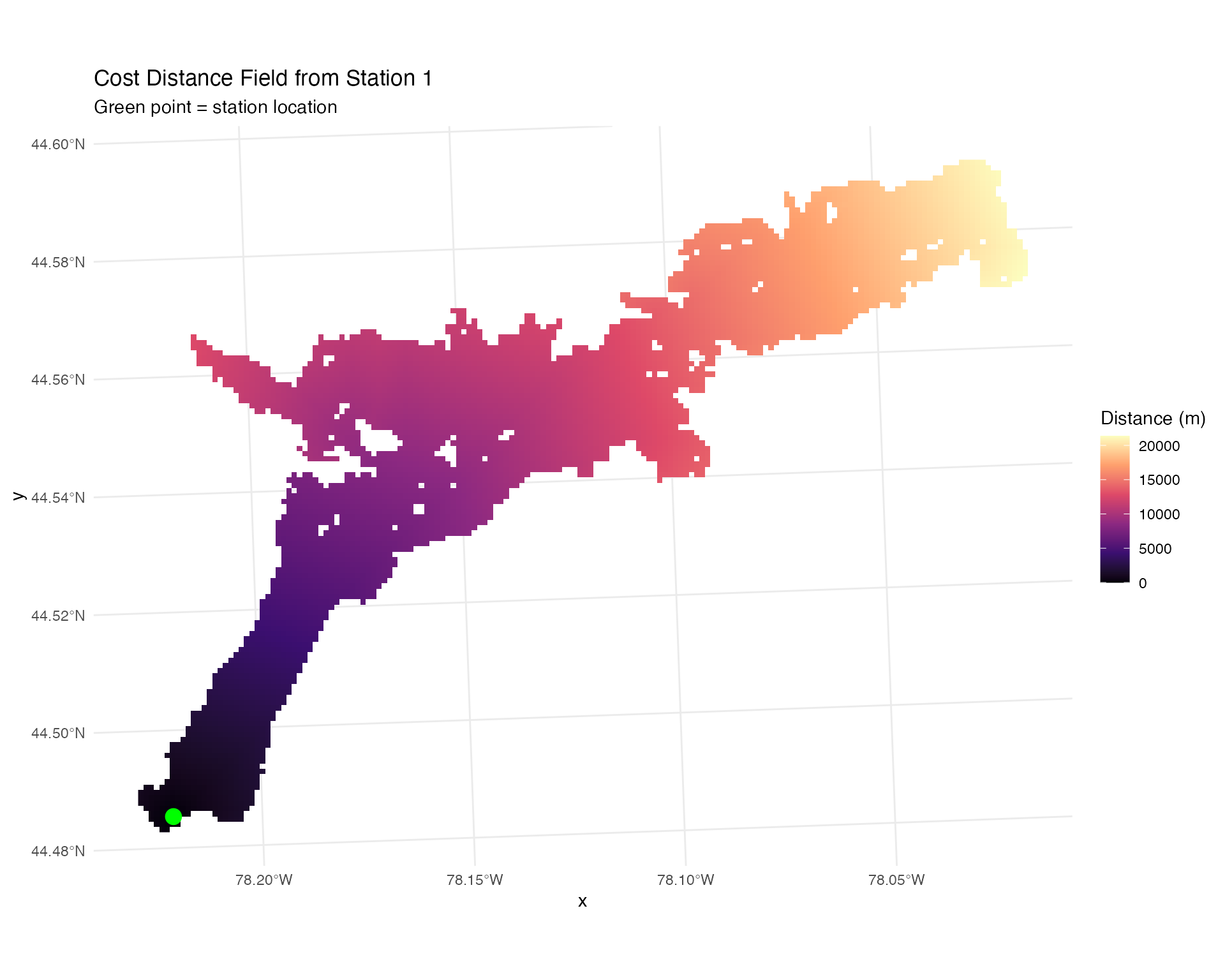 Calculate cost-distance and straight-line distance from each receiver to all raster cells. This is essential for modeling detection efficiency across the study area: