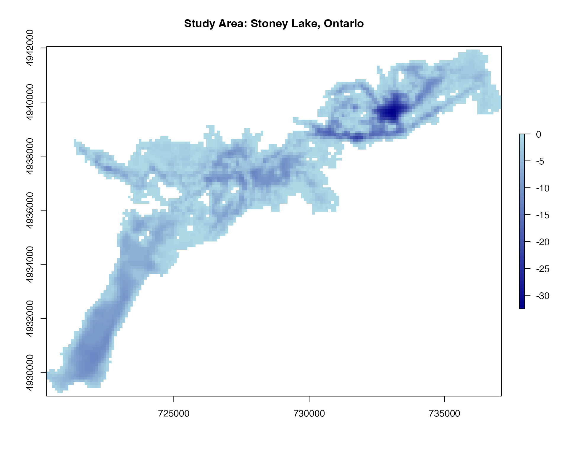 Weβll use the example depth raster of Stoney Lake, Ontario, Canada included in the package: