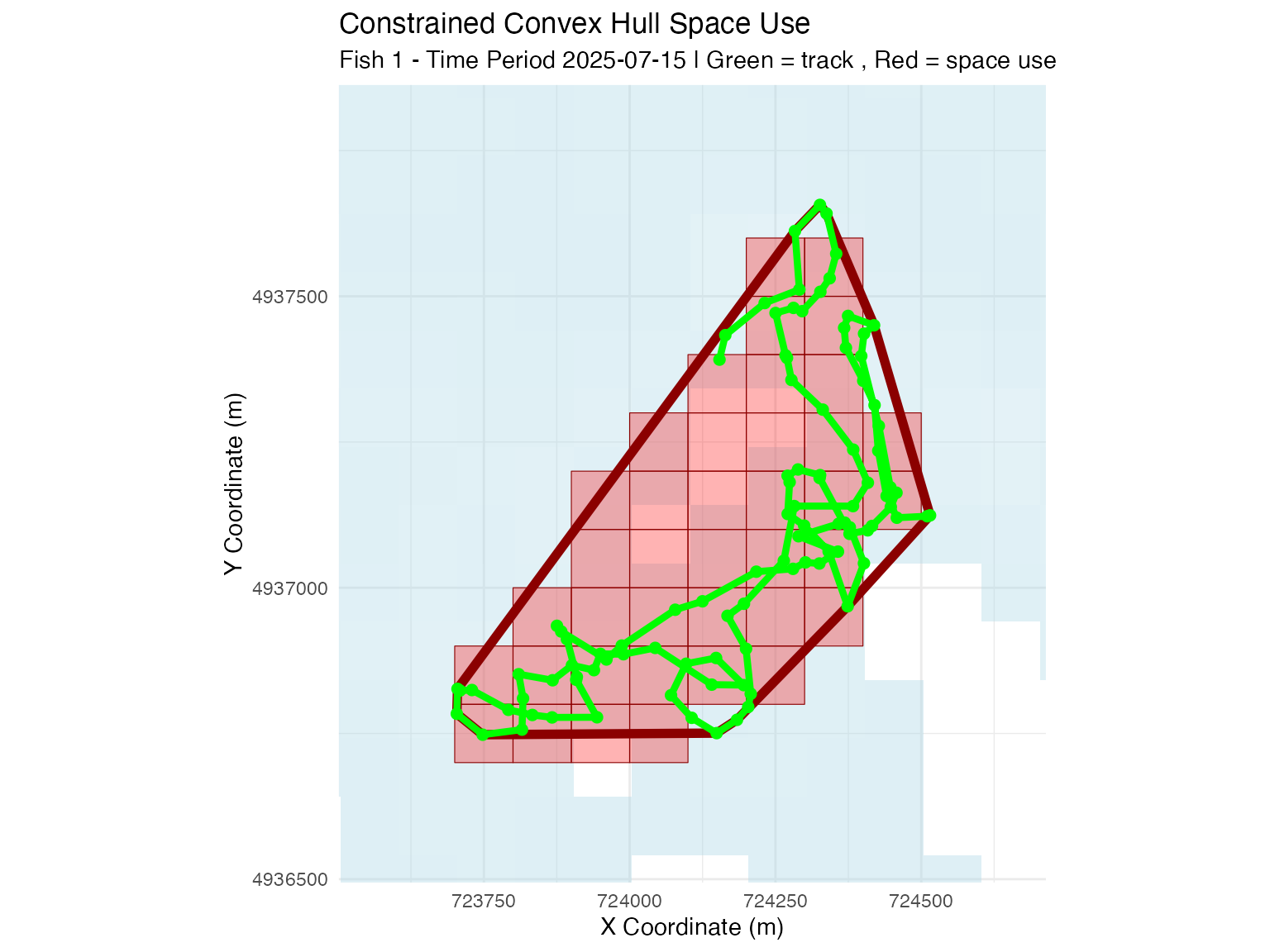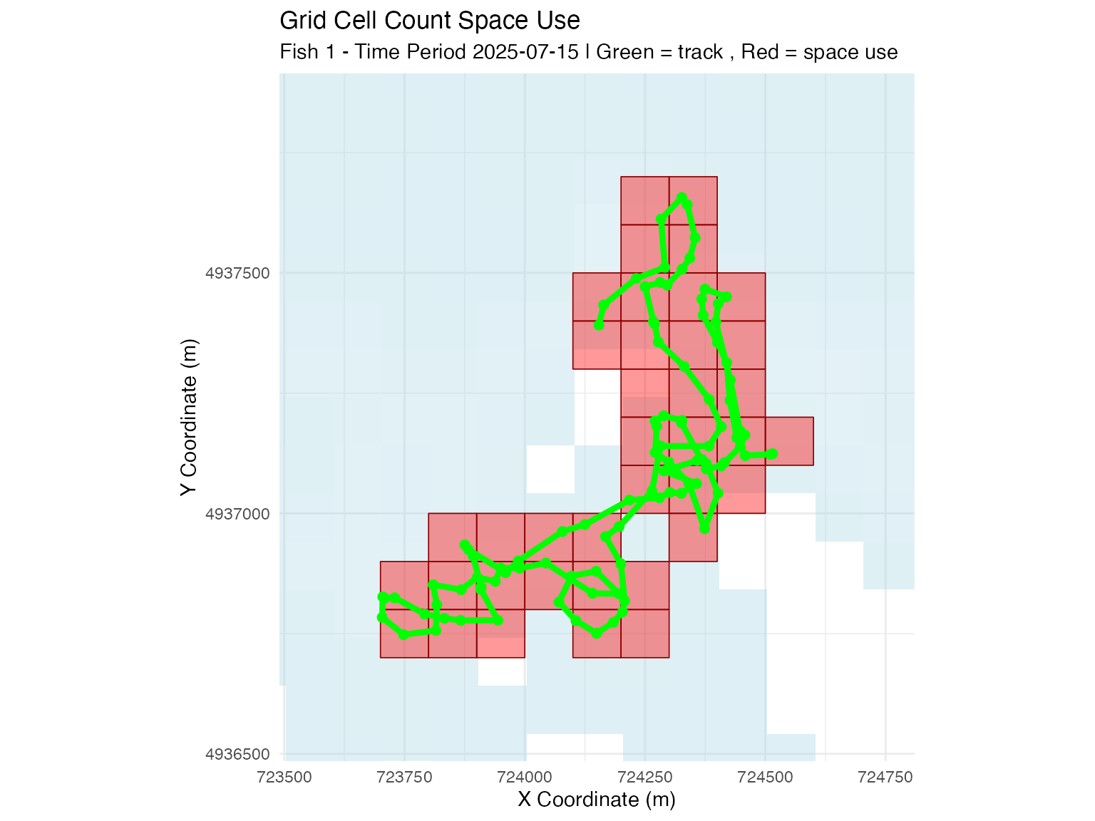 ## fish_id = 1, time_period_label = 2025-07-15, time_period_posix = 1752537600 : sampled 1000 points from 33 cells (total usage: 101 track points)