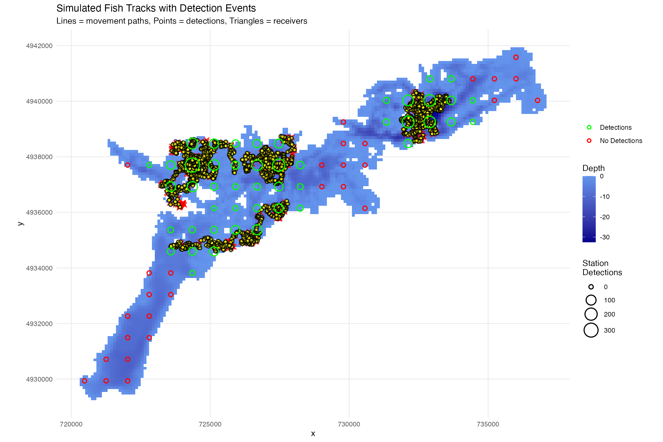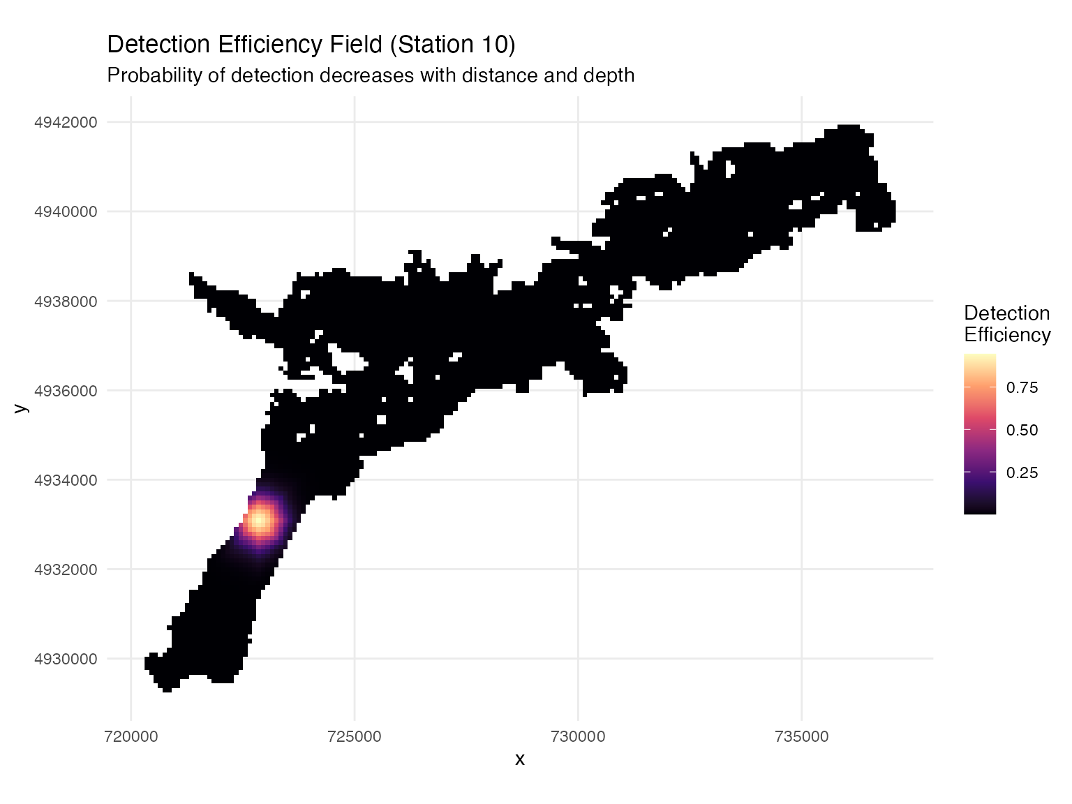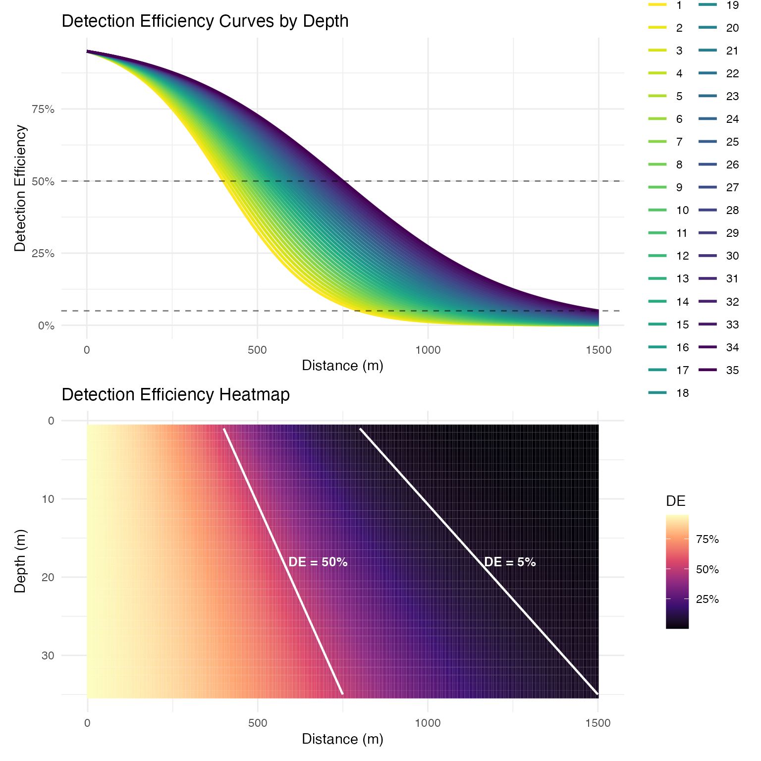 Tools for generating reasonable detection range models that integrate depth are provided, although it is much more optimal to use real detection range data and models to inform this. Detection range varies considerably over space and time due to variation in environmental conditions.