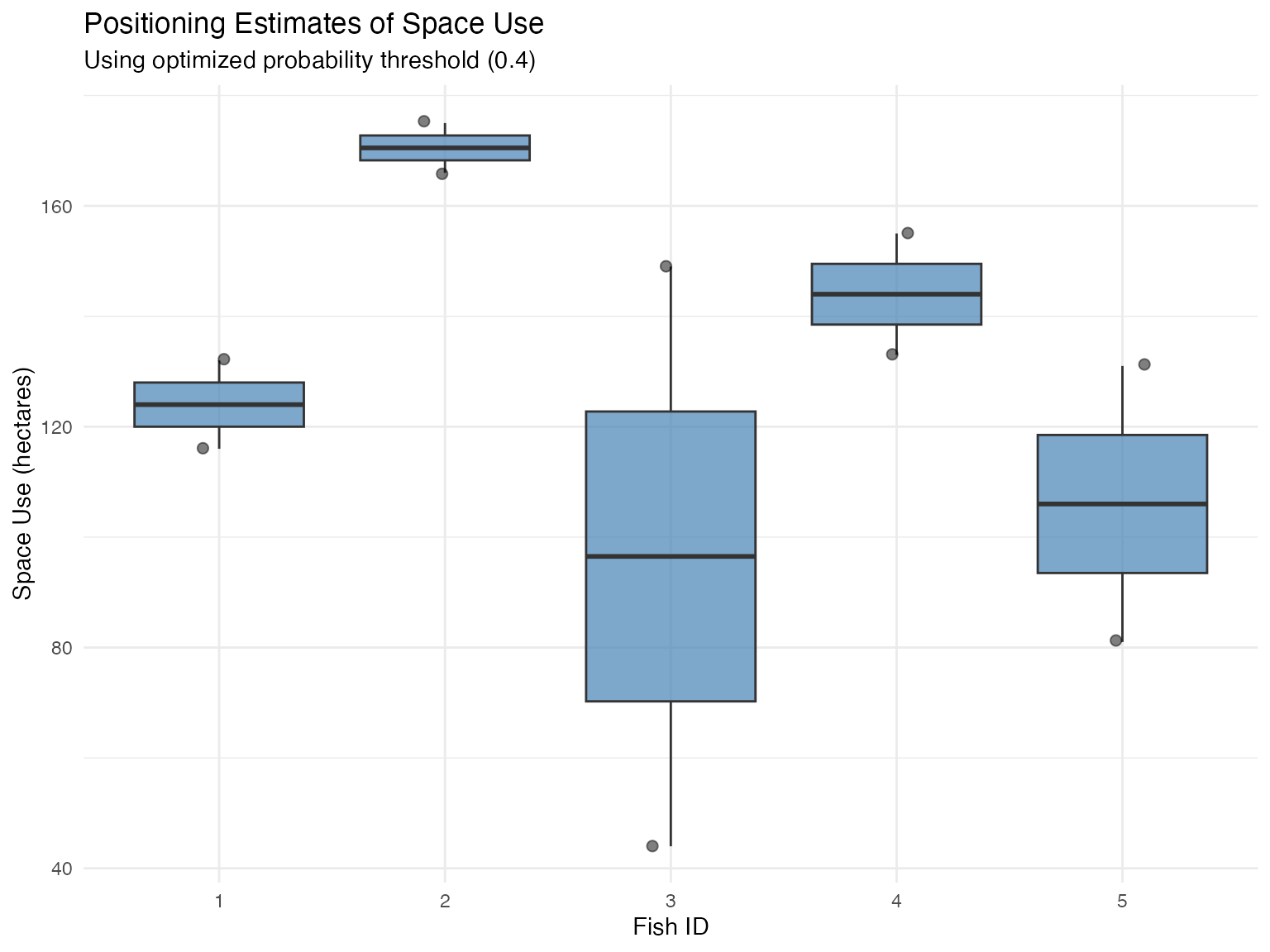 Here we’ve used a simulation based dataset to conduct WADE positioning, which produces useful outputs for assessing space use (home range) and habitat selection from acoustic telemetry data.