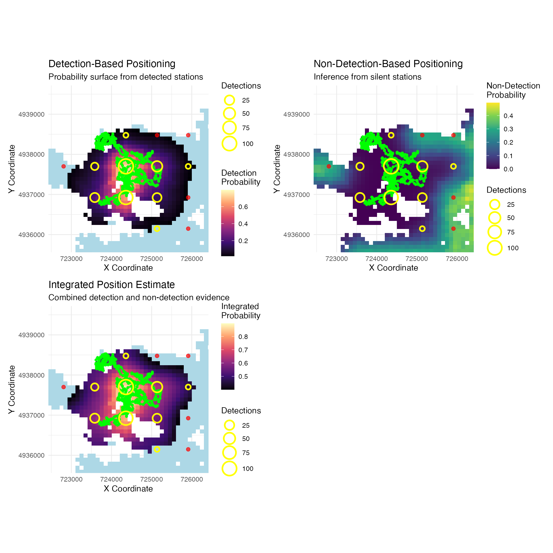 This tutorial demonstrates the Weighted Average Detection Efficiency (WADE) approach for animal positioning using passive acoustic telemetry. It uses detection range information to generate estimates of probable animal locations based on detection patterns, which is useful for estimating space use (home range) and habitat selection. This approach using simulated data is a useful exercise to assess positioning accuracy and optimal settings relative to known tracks, which may be useful to conduct prior to field data applications where positioning can be influenced by system design, detection range, and animal behaviour.