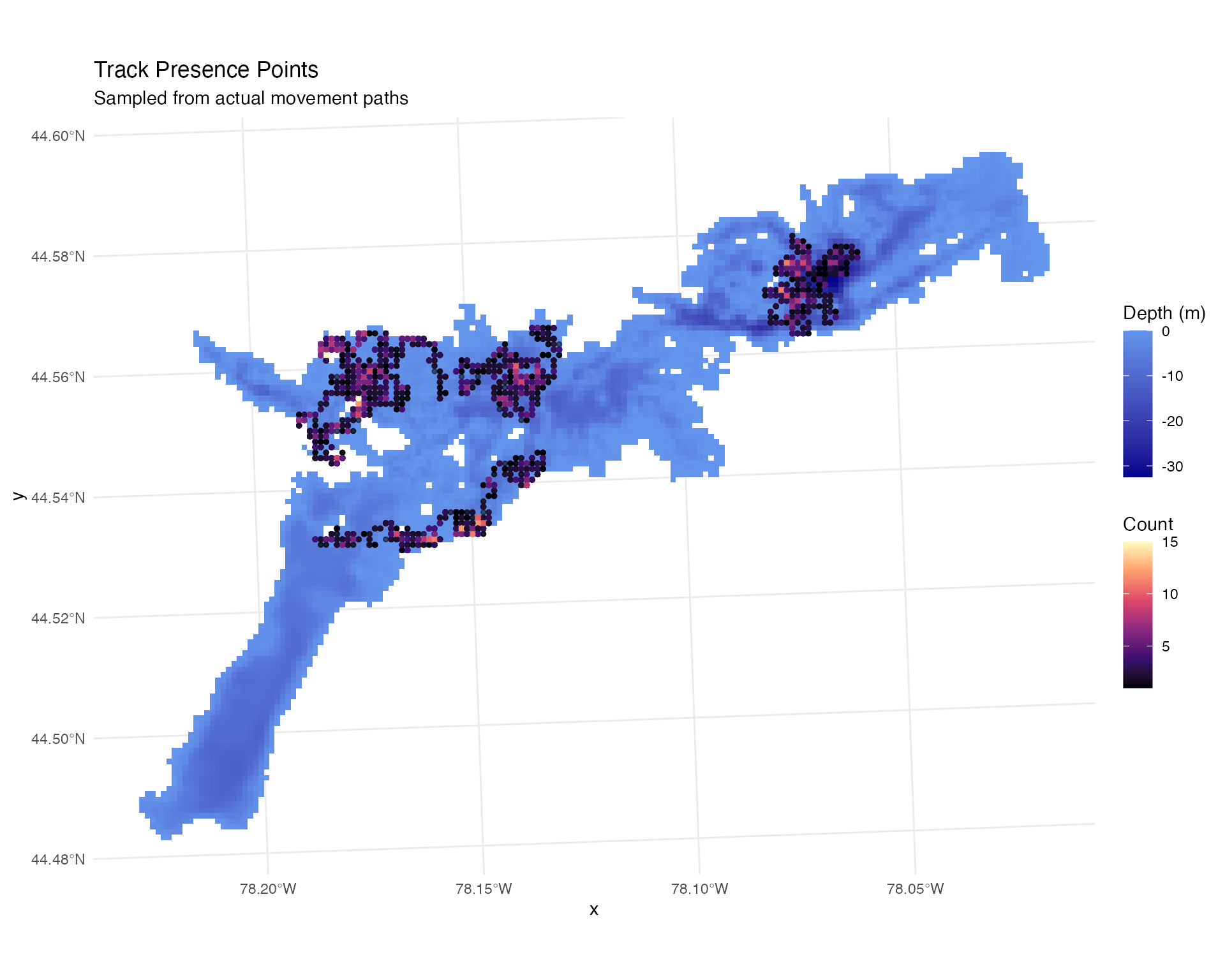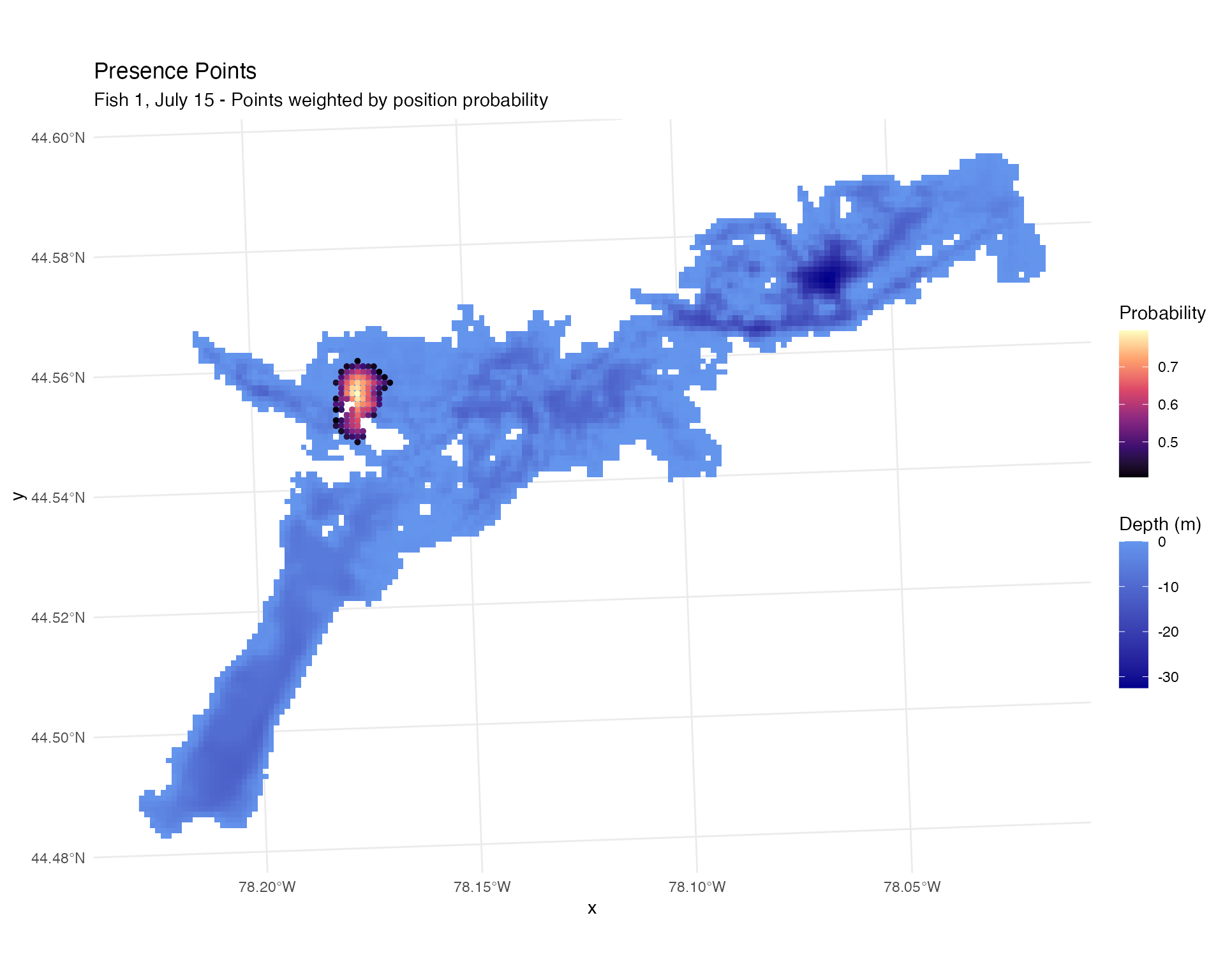 ## fish_id = 5, time_period_label = 2025-07-16, time_period_posix = 1752624000 : sampled 1000 points from 84 cells (total usage: 241 track points)