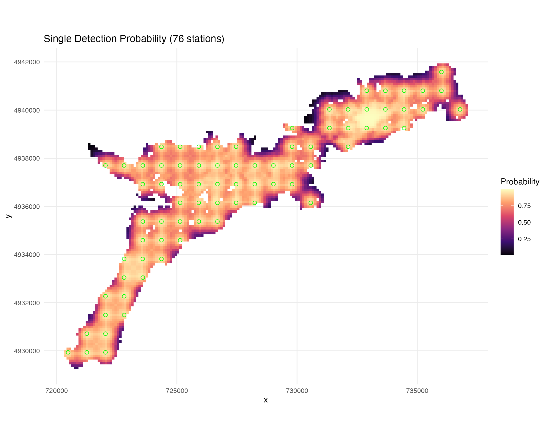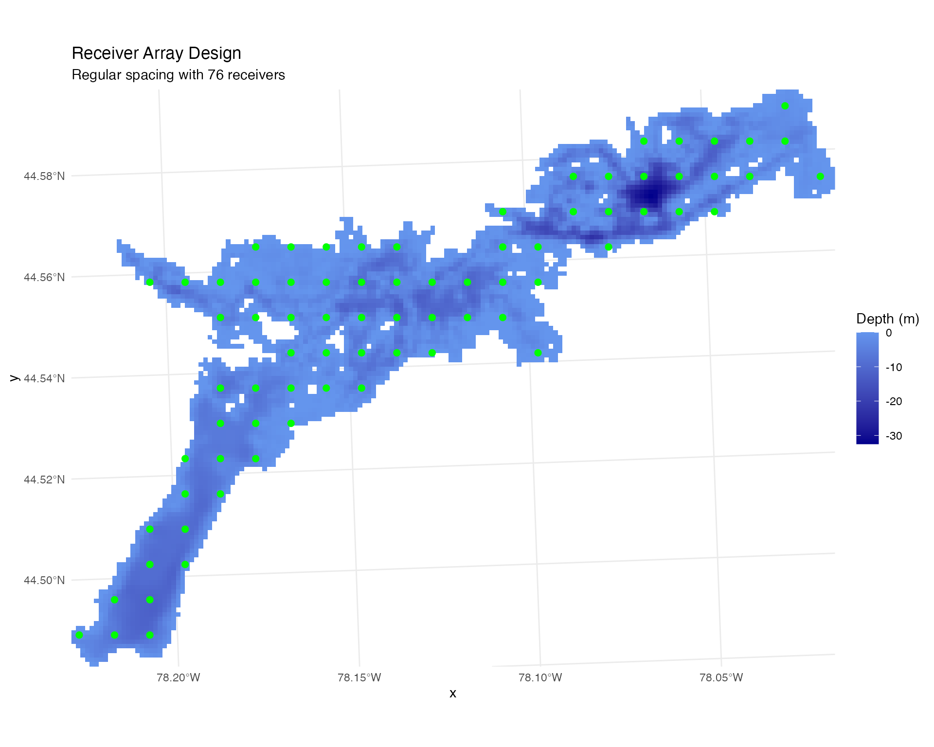 subtitle = paste("Regular spacing with", nrow(points_regular), "receivers")) +